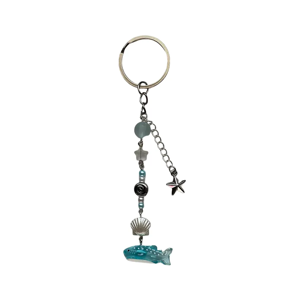Llavero plateado de tiburón ballena celeste, hecho con materiales de bisutería.